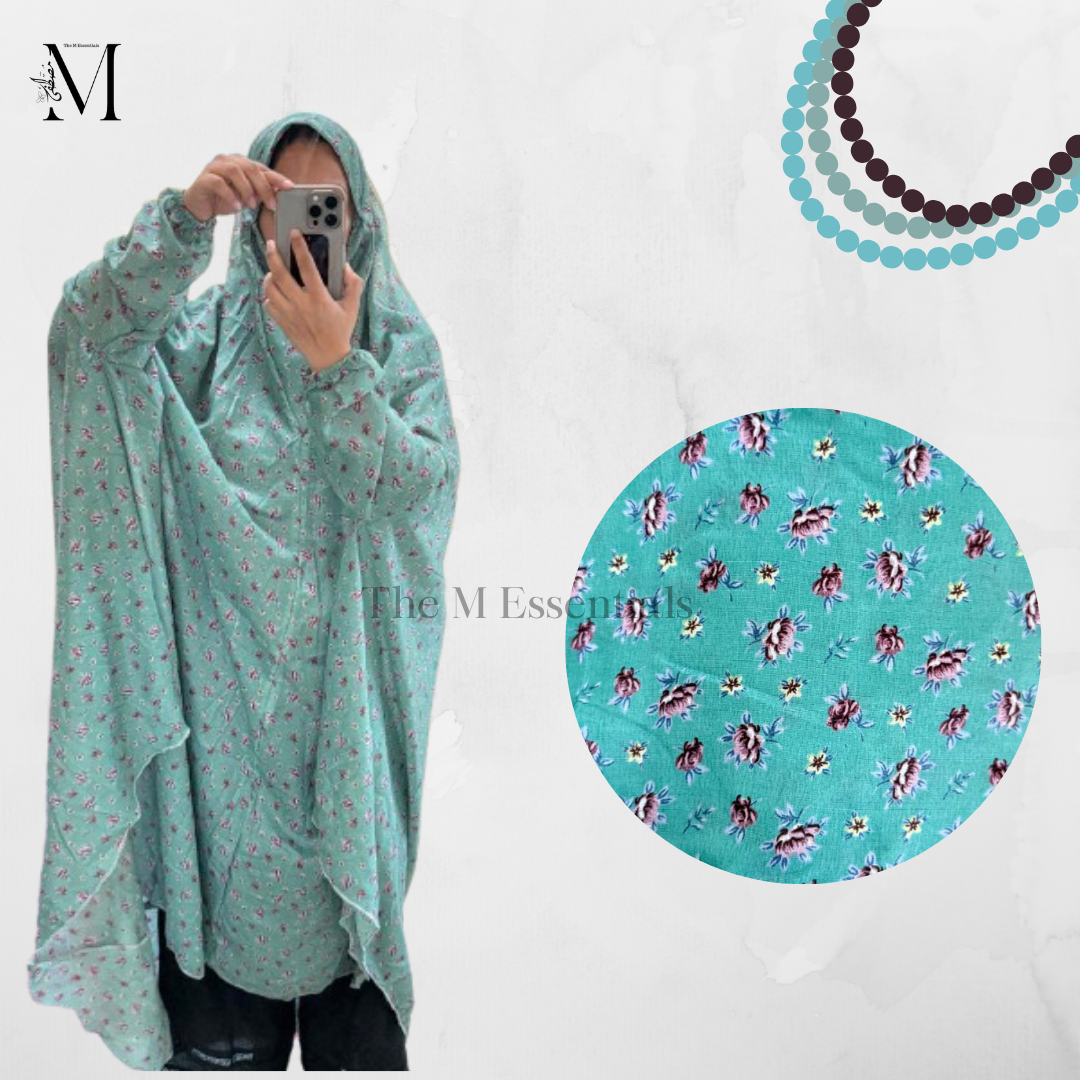 Makhani Hijab or Namaz Chaddar in soft cotton printed fabric with elastic sleeves and elastic headband.